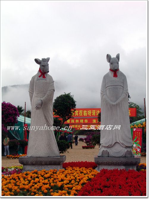 朋友和我叫嚣着让我到诺达欢乐雨林去,说的是天上少有地上难寻,我表示怀疑。 热带雨林? 狮子的老爸在三亚的一个月一直嚷嚷着要去热带雨林,我们忙的没有时间去,也不知道哪里有真正的热带雨林,所以之乎者也的含糊过去,害的老爷子在去兴隆的路上看到稍微高点的山坡在诧异着说:“哇,三亚真好,到处都是热带雨林......”我和狮子相望红脸的低头傻笑。 其实 真正的热带雨林我貌似去过,曾经爬过锦母角到虎头湾的山,树林茂密,无路可走,满眼的绿色,树枝缠绕,很美很美,算是热带雨林嘛?不清楚哦! 印象很深的就是回来后 我的老腿3天不能动,累惨了! 等着机会,等着狮子休息,拉帮结伙的跑到在耳边萦绕了一个春节的地方。心情呢?满怀希望嘛?貌似没有 ,在三亚这么多年了,大大小小的景点去的太多了,很少有那种热烈的盼望一个地方的感觉了。说心里话,我想着 也就是那么个地方吧!只是盼着景区内路好走点,不要让我太辛苦,唉,老了!耐不起折腾啦!嘿嘿。 2月16日,早上9点出发,沿着五指山的路上奔驰,五指山方向的路很是崎岖,环环绕绕的,我很是变态的喜欢这样的路况,我不喜欢平坦,乏味的高速,觉得这样的路可以让坐车的更加有韵味的欣赏两旁的风景,看着转弯,体会偶尔的惊心,我想司机一定不这么想,所以此生估计和开车这个技术工种无缘了。 第一次,大家都是第一次到这个呀诺达欢乐雨林一车的人翻看着地图,找着三道镇的位置,倒是真的有点自驾游的味道.人多的好处就是不会无聊,坏处就是主意多,指挥的也多,在三道镇的路口 我带领着大家七嘴八舌的喊着拐弯..... 结果,错了!车退回来后望向前方,不远处就大大咧咧的摆着呀诺达欢乐雨林的标志,嘿嘿我低头无语。 整个路口到景区之间都是石子铺的路,我们这群人又开始分析是没有修好,还是特意而为?减速? 这群人啊 什么都研究! 通往景区的路上很人为的做了好多的摆设,招牌,花朵,绿色。虽然是春节后期的大旺时期这里却是人少车少,看来试营业的VIP还真的是很VIP哦! 到了大门口,看到景区内的工作人员着装整齐的坚守自己的岗位,哈哈 ,嗯,不错,企业文化不错哦! 表扬下! 下面开始看图说话, 图片自己拍的,水平有限,大家看个意思,而且我坚持的认为这种热带雨林的美不是图片可以提现出来的。至于游览回来后我的感受是失望?值得?还是期待? 且大家慢慢看下去!道士还是老鼠? 在呀诺达欢乐雨林的入口处屹立着这样两个塑像,我进门的时候恍惚的看了一眼,根本就没有往心里去,在三亚,在景区,这样的东西实在的太多了,林林总总的,我在一瞬间看过后留给自己的概念就是,门口立着两个道士的雕像。然后就大摇大摆的进去了,在回来整理图片的时候仔细的看了 一眼,哇,这个道士的耳朵好大啊!然后十分认真的在看一眼。天啊,两只老鼠!公老鼠谦谦有礼,母老鼠头戴大花风韵万千,还是唐朝的趔! 抹胸啊! 佩服十分的佩服,这是哪个的创意啊! 据不完全的内部消息,这个地方将建立一个生肖广场,届时12年的属相都将携夫人屹立在此! 哈哈,我十分期待那一天,一定挨个的和他们合影留念! 老鼠道士